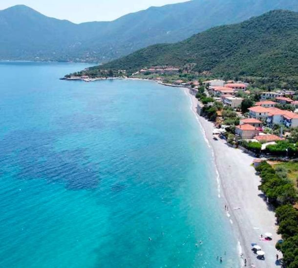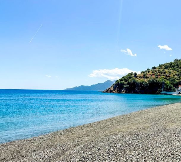 Small sandy bay with green/turquoise water and a small cave. 5 minutes from Leonidio