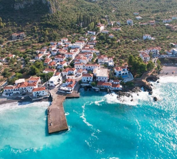 Unpretentious seaside jewel situated below the Parnon green and rocky mountain, by the Myrtoan Sea, this village reminds of a Greek island before the tourism boom. Lovely beaches with olive and cypress trees