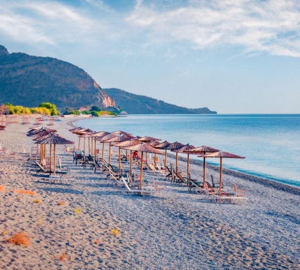 Peaceful beautiful beach about 2 km long, with a rounded pebble & sandy shore. Very clear water, ideal for swimming.